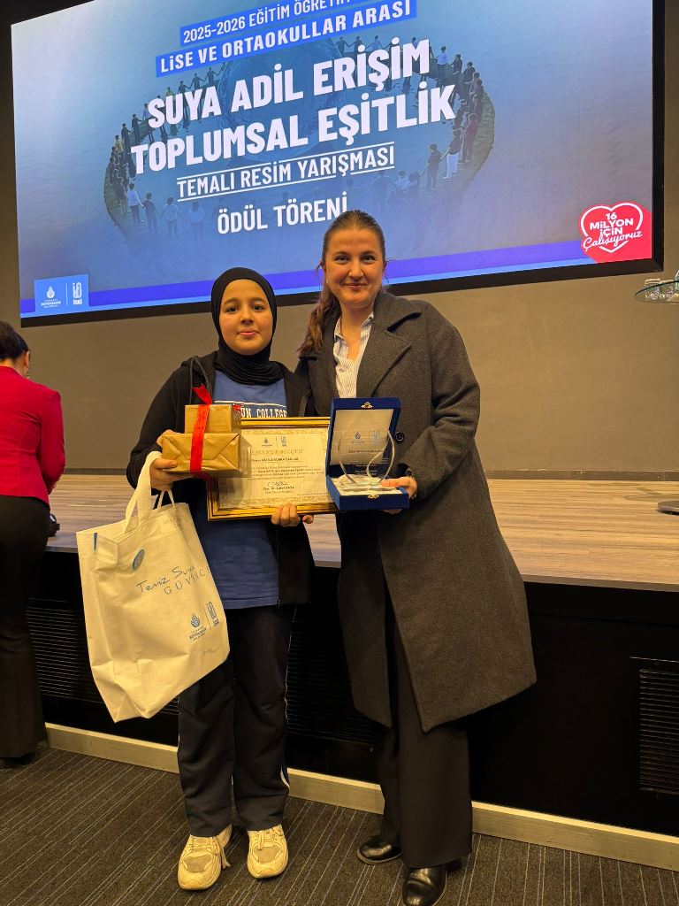 İstanbul genelinde düzenlenen “Suya Adil Erişim ve Toplumsal Eşitlik” temalı resim yarışmasında, Ortaokul Öğrencimiz Hatice Kübra Çağlar bizleri gururlandıran bir başarıya imza attı. Genç yeteneğimiz, ortaokullar kategorisinde İstanbul üçüncüsü seçilerek büyük bir takdir topladı.